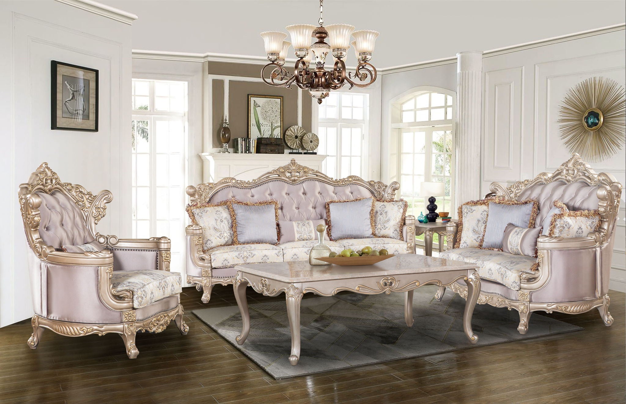 Introducing the Camila Living Room Set, where traditional glamour meets sophisticated elegance. This exquisite set features beautifully crafted pieces adorned with unique wood carvings that add a touch of artisanal charm and opulence. The luxurious fabric upholstery complements the intricate detailing, while the tufted seats enhance the set's classic appeal with their plush, inviting comfort. Each element of the Camila Silver Living Room Set is designed to create a stunning focal point in your home, blending timeless beauty with a touch of glamour for an exceptional living space.
