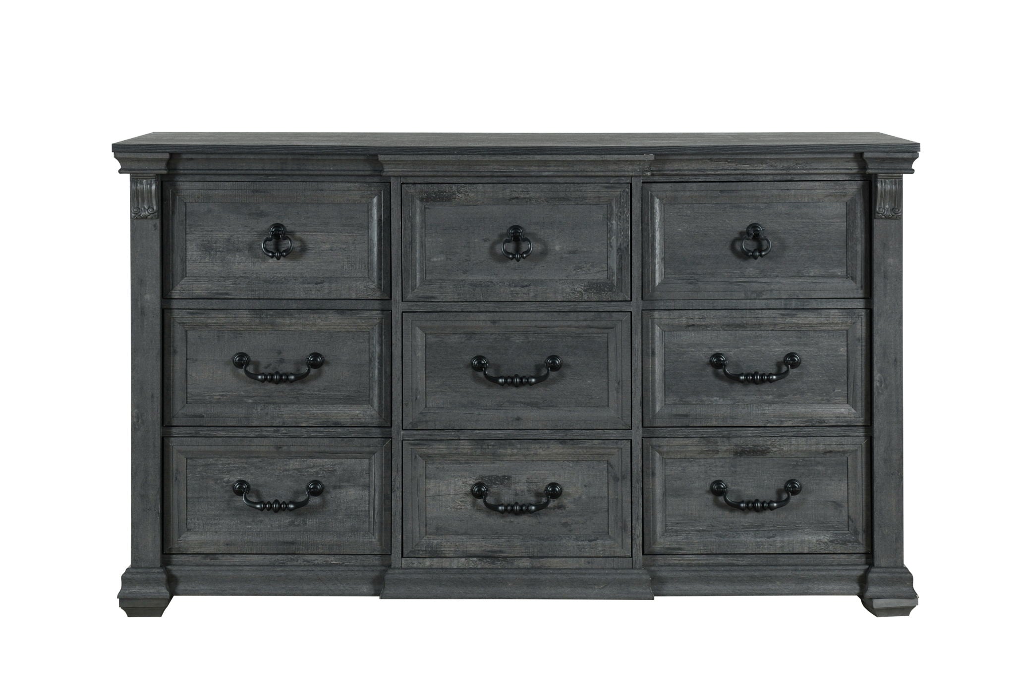 Organize your clothing and accessories in style with the Rowan/Tatum Dresser. The rustic wood finish, intricate trim, and scroll work combine to create a stunning piece that enhances the beauty of your bedroom.