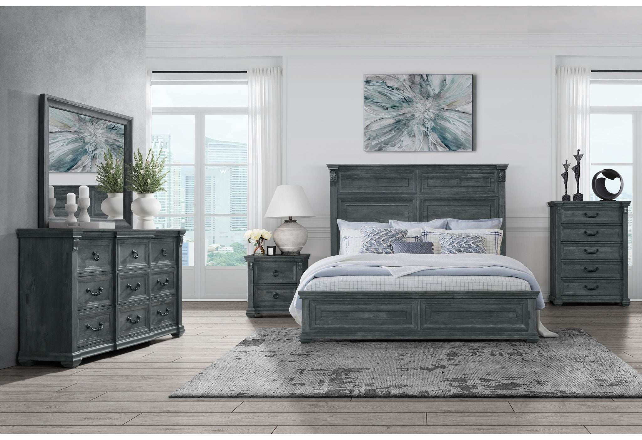 The Tatum Bedroom Collection is crafted with a rustic wood finish available in natural or grey, this classic collection boasts intricate trim, rustic drawer hardware, and elegant scroll work on every piece. The large panel headboard on the bed adds a grand touch to your bedroom.